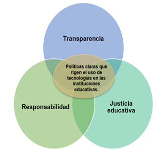 En tal sentido, si se trata de ubicar la intersección de los términos: transparencia, responsabilidad y justicia educativa, se evidencia la necesidad de establecer políticas claras que rijan el uso de tecnologías en las instituciones educativas. Al respecto, Bahar et al. (2023) respaldan la creación de marcos normativos que no solo regulen el uso de IA, sino que también promuevan prácticas educativas equitativas y accesibles. Según el estudio, "las políticas deben ser el resultado de un diálogo inclusivo entre todos los actores involucrados, incluyendo a estudiantes, padres, educadores y desarrolladores de tecnología" (p. 15). Seguidamente se presenta la figura 5.