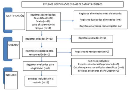 En la etapa de identificación, se inició con un total de 30 estudios de las bases de datos: Scopus (12), SciELO (10) y Web of Science (8). Sin embargo, se eliminaron 6 artículos duplicados y 4 marcados como ilegibles por herramientas de automatización, un número significativo de registros. Durante la etapa del cribado, se analizaron 20 artículos, luego 5 fueron descartados por no cumplir los criterios de inclusión establecidos en la revisión, quedando finalmente, 15 artículos para su análisis. La figura 1 sintetiza los pasos antes descritos.