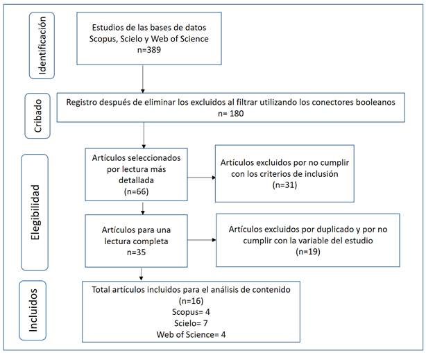 De acuerdo con lo presentado en la figura 1, la metodología PRISMA permitió una elección apropiada de los artículos a analizar, iniciando con 389 estudios, de los cuales resultaron 180 en el primer filtrado; posteriormente, se seleccionaron 66 artículos para una lectura más detallada; luego, se excluyeron 31 que no cumplieron con los criterios de inclusión, quedando 35 artículos para una lectura completa. De tales investigaciones, se excluyeron 19, para finalmente, seleccionar 16 estudios en total entre las bases de datos Scielo, Scopus y Web of Science.