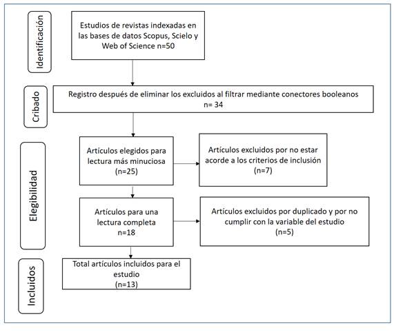 La metodología moderna, siguiendo estándares como PRISMA, condujo a partir de una pregunta de investigación, seleccionar los estudios de las bases de datos (Scopus, WoS y Scielo) y definir palabras clave y operadores booleanos (AND, OR). A continuación, se presenta la figura 1, donde se expone la selección según la declaración PRISMA.