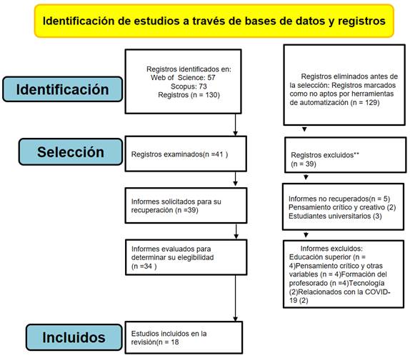 Luego, se evaluaron 39 artículos en texto completo. De estos, 21 fueron excluidos por diversas razones referidas a educación superior, pensamiento crítico, formación docente, tecnología y relacionados al COVID.
