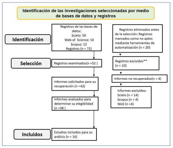 Los estudios seleccionados derivaron de una indagación que inicialmente fueron 72 artículos: 50 artículos de Scielo, 12 de Scopus y 12 de WoS; de allí, 20 fueron considerados no aptos, resultando 52. Se excluyeron 10 para quedar 42, luego se continuó con el proceso de filtrado, resultando 38, de los cuales se excluyeron 22, para finalmente analizar 16 artículos mayormente relacionados con el tema de investigación. Cabe resaltar que, en la indagación, se ubicaron términos clave como “Iconografía”, “Tejido Matsigenka”, “Educación artística”, “Educación intercultural”, a fin de facilitar la búsqueda de la información.