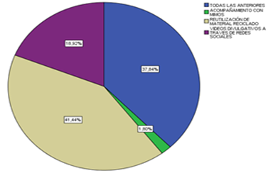 Como se presenta en la figura 2, se determinó que la mayoría de encuestados considera como una de las mejores estrategias para fortalecer el reciclaje en la Institución Educativa es la reutilización de material reciclado, también existe un importante porcentaje que están de acuerdo con todas las estrategias enumeradas como el acompañamiento con mimos, y los videos divulgativos a través de las redes sociales, señalando así, que es muy necesaria la comunicación para fortalecer una campaña de reciclaje en la Institución.