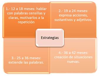 Las estrategias aplicadas de forma correcta, disciplinada y oportuna, los resultados a obtenerse serán positivos, siempre y cuando se descarten problemas médicos, a cada edad se le asigna estrategias para desarrollarlas, por cuanto es importante respetar sus áreas de desarrollo de acuerdo con su grupo etario. Siempre hay que tomar en cuenta las emociones de los niños, es imprescindible demostrarles afecto y comprensión, la paciencia, el amor hacia los hijos será fundamental para un desarrollo efectivo, por cuanto los niños aprenden lo que ven y repiten todo lo que escuchan a su alrededor, pero esto no pasa en todos los niños, desde que nacen el niño siente la necesidad de comunicarse, lo hace con la persona más cercana, su madre, por eso los expertos sugieren estimular desde el vientre materno, de ahí que se recomienda las siguientes estrategias:
