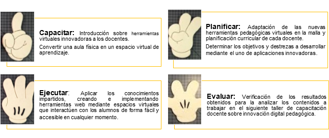 La implementación de un cronograma de capacitación continua fortalece la actividad docente, en especial en aspectos tales como pedagógicos, sociales y tecnológicos, siendo este último uno de los más importantes durante el proceso de trabajar desde casa, considerando las muchas de las situaciones que se presentaron y que en más de una vez pusieron a prueba el nivel de conocimientos de los docentes para tratar de solventar estos problemas. Por tal razón se puede determinar un proceso continuo de capacitación docente mediante la coordinación de talleres de capacitación que deberán seguir un esquema denominado CPEE.