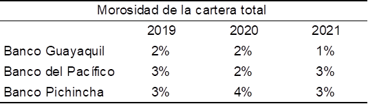 Revisando la cartera de crédito, se observa que en los tres bancos hay una disminución del año 2019 al año 2020, en un promedio del 9%, no obstante, en el año 2021 se nota una recuperación en todos los bancos, a excepción del Banco del Pacífico.