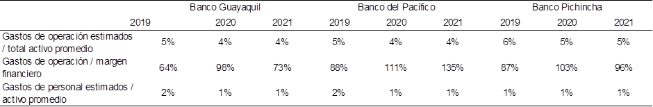 Manejo corporativo: de los resultados de gastos operativos sobre el total de los activos, se pueden observar que, en todos los bancos, durante los años 2019 y 2020, disminuyen en un 1% y este valor se mantiene durante el año 2021, indicando que en proporción fueron eficientes en el uso de los recursos. Sin embargo, al analizar los gastos operativos en relación con el margen financiero, se determina un incremento importante en todas las instituciones bancarias, denotando que no se dio un buen manejo administrativo, ya que una gran proporción del margen financiero se destinó a los gastos operacionales.