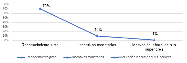 Con respecto a la variable motivación, y de acuerdo a las interrogantes planteadas para el análisis de esta, en la figura 4 se puede apreciar que la mayoría de los trabajadores coinciden con el criterio de que reciben un reconocimiento justo por su labor, lo cual es un factor positivo para la empresa, porque crea estabilidad laboral, sin embargo, no sucede lo mismo con las interrogantes incentivos monetarios y motivación por parte de sus superiores, debido a que un porcentaje mínimo de los encuestados asegura que recibe este tipo de incentivos, lo cual desencadena en empleados con falta de compromiso, moral, satisfacción, y sentido de no pertenencia con la empresa, Arenal (2022) menciona que la ausencia de estos incentivos tanto monetarios como no monetarios afecta a la motivación de los colaboradores. Por el contrario, cuando se aplican incentivos se genera un sentido de pertenencia con la empresa, disminuye el absentismo, evita el conflicto y sobre todo aumenta la productividad. Afirmación por la cual podemos inferir que la variable motivación está afectando a la productividad de la empresa.
