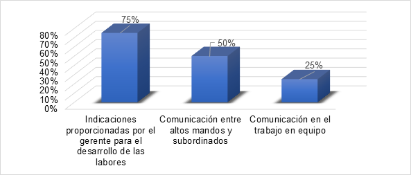 En la variable comunicación reflejada en la figura 5 se puede observar que la percepción que tienen los trabajadores respecto a las indicaciones oportunas proporcionadas por el gerente para el desarrollo de sus funciones, está ubicada en un valor de referencia medio, lo cual hace notar que no es un valor deficiente, no obstante, requiere de mayor atención para minimizar situaciones como desconocimiento o falta de coordinación de las tareas a realizar, con relación a las interrogantes que hacen referencia a la percepción de comunicación propicia tanto entre los altos mandos y comunicación en el equipo de trabajo, estos se ubican en un rango deficiente, la falta de comunicación de los líderes hacia su equipo de trabajo ocasiona que sus colaboradores no tengan claro los objetivos de la empresa, y la manera en la que se debe actuar para conseguirlo, de igual forma la escasez de comunicación entre el equipo de trabajo provoca conflictos, ya sea porque desconocen la urgencia de ciertas tareas o simplemente la comunicación no es clara y precisa. Todos estos factores repercuten negativamente en la productividad de la empresa, tal como lo indica (Aguilar, 2021) Una buena comunicación promueve el entendimiento entre los trabajadores, motiva la innovación y creatividad, haciéndolos más productivos y eficaces en la consecución de objetivos.