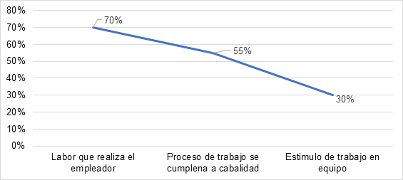 En la figura 3 se puede apreciar la variable satisfacción en el trabajo, la cual es analizada mediante la consulta de percepción que tienen los empleados, tanto del ambiente de trabajo, como del nivel de confianza que existe entre ellos, el resultado obtenido de las dos interrogantes se ubicó en un valor de referencia bajo de acuerdo a los indicadores de gestión proporcionados por Cedeño & Sacón (2016), se puede deducir que estos dos puntos consultados tienen relación directa, pues al no existir suficiente confianza con los miembros de la organización, se genera un ambiente de trabajo no propicio, lo que a su vez repercute claramente en el nivel de satisfacción en las labores que realizan, puesto que esto refleja que los empleados están realizando su trabajo por obligación más que por satisfacción y de acuerdo a Robbins (2000) existe una relación estrecha entre un trabajador satisfecho en su ambiente laboral con su productividad, por tal motivo podemos ver que la productividad laboral de la empresa está siendo afecta por esta variable.