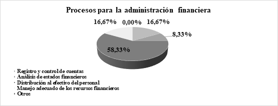 De igual forma se debe de tomar en cuenta que la administración financiera es una de las áreas tradicionales que comprenden un proceso de gestión y gerencia de cada organización indistintamente de su tamaño o del sector al que pertenezca dicha empresa conforme lo manifiestan (Cabrera & Fuentes, 2017) en su análisis de la gestión financiera y que a su vez esta afirmación se relaciona con lo mencionado en el gráfico número cinco, del presente trabajo, mismo que hace referencia a la distribución del dinero al personal de la empresa, con un 58,33% de los encuestados que manifestaron que se debe tomar en cuenta los procesos necesarios para llevar el uso del dinero correctamente y una buena toma de decisiones como lo señala el autor (Huacchilo, 2019), en su artículo científico titulado. “La gestión financiera y su incidencia en la toma de decisiones financieras”