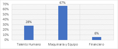 En cuanto a la relevancia de los recursos para la eficiente ejecución de los proyectos viales el 67% de los encuestados manifiesta radica en la funcionalidad de la Maquinaria y Equipo asignado; 28% establece depende del talento humano; mientras que únicamente el 6% establece se debe a el recurso financiero.