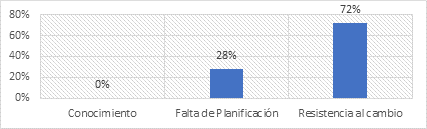 El 72% de los encuestados coinciden que se debe a la resistencia al cambio y la falta de compromiso del personal para hacer un levantamiento de información y elaborar un plan de mantenimiento; mientras que el 28% establece que se debe a la falta de planificación.