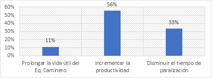 Como resultado se obtiene que el 56% considera que se incrementará la productividad; el 33% que se disminuirá el tiempo de paralización del equipo caminero; mientras que el 33% restante establece se prolongará la vida útil del equipo caminero.