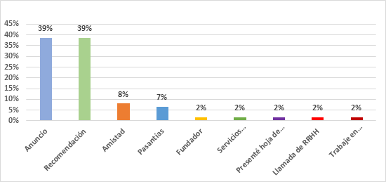 En este apartado investigativo se establece que la mayor parte de los empleados ingresaron a la institución financiera mediante recomendaciones. En un estudio hecho en la Cooperativa de Ahorro y Crédito CACEC Ltda. se especifica que alrededor del 36% de los empleados ingresaron a la institución por medio de recomendaciones; el 46% accedieron a través de postulaciones; el 10% por pasantías; el 8% por formar parte de los creadores institucionales (Gobeo, 2018).