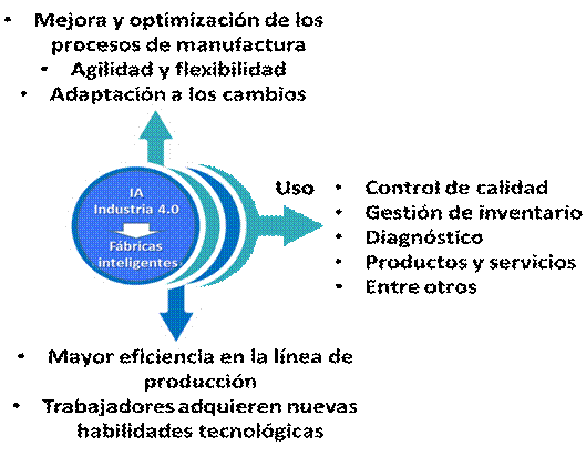 En la figura 1, se puede observar la transformación que se puede aplicar en las industrias 4.0 inteligentes con la utilización de la IA; lo cual trae varios beneficios en favor de una mejora continua mediante la automatización, la robótica, algoritmos garantizando una industria manufacturera actualizada y dispuesta a competir con un mercado cambiante.