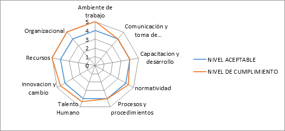 Observando la tabla 3 de los factores de la Gerencia de Talento Humano con respecto al nivel aceptable y al nivel de cumplimiento es notable que los resultados obtenidos superan en su mayoría al nivel aceptable, tal es el caso de ambiente de trabajo con 4,3, procesos y procedimientos con 4,6, talento humano y recursos con 4,4 así como también normatividad y organizacional superaron el nivel aceptable con 5. Por otra parte las dimensiones de capacitación y desarrollo e innovación y cambio se mantuvieron en el mismo nivel 4.