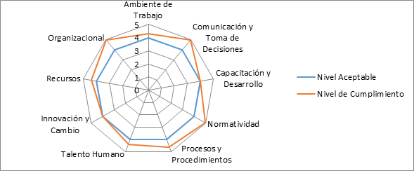 De acuerdo a los aspectos evaluados en la Unidad de Servicios Generales se pudo constatar que la mayoría de las dimensiones obtuvo un nivel de cumplimiento superior con relación al nivel aceptable, arrojando como resultado normatividad con 4,3, talento humano con 4,4, innovación y cambio con 4,6, así como se pudo evidenciar el resultado de ambiente de trabajo, recursos y organizacional con un nivel de cumplimiento 5, mientras, que al evaluar las dimensiones de comunicación y toma de decisiones, capacitación y desarrollo, procesos y procedimientos dieron como resultado un nivel de cumplimiento 4 al igual que el nivel aceptable.