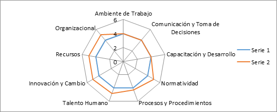 En cuanto al diagnóstico se evaluaron las áreas de: Gerencia de Servicios Generales, Gerencia de Talento Humano, Gerencia de Finanzas y Gerencia de Seguridad Higiene y Ambientes, en las cuales se determinaron como puntos fuertes las dimensiones de ambiente de trabajo, comunicación y toma de decisiones, normatividad, talento humano, recursos y organizacional, todos ubicados por encima del nivel aceptable.