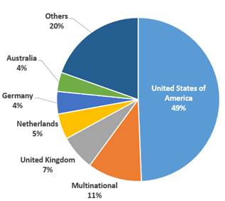 According to Figure 1, enterprise architecture framework initiatives for the public sector abound internationally (between them they constitute 44% of sector-specific frameworks). The majority of sector-specific frameworks are developed for the IT domain (42%). Among these, the frameworks developed for defense and government management stand out. According to the figure, government frameworks constitute the largest proportion (33%), this sector being one of the first to develop frameworks since the birth of enterprise architecture as a discipline. The public sector has been at the forefront of the development and application of enterprise architecture frameworks, as one of the most important models has been developed for this sector. This occurs because public organizations have had leadership, at least, in the major economic powers worldwide, in automating their processes and services to society. The Figure 2 illustrates the countries of origin of the frameworks.