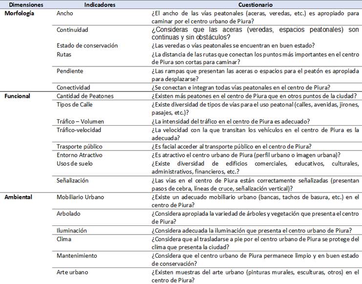 Se utilizan encuestas para recopilar la percepción de los entrevistados mediante dos cuestionarios: uno con 22 preguntas sobre la calidad del espacio público (Tabla 1) y otro con 20 preguntas sobre la movilidad peatonal (Tabla 2). La validez de estos cuestionarios se basa en fundamentos teóricos y se valida con el índice LAWSHE por cinco expertos. La confiabilidad de los instrumentos es respaldada por una muestra donde se obtiene como coeficiente Alfa de Cronbach 0.93 para la variable calidad del espacio público y para la variable movilidad peatonal un coeficiente de 0.91.