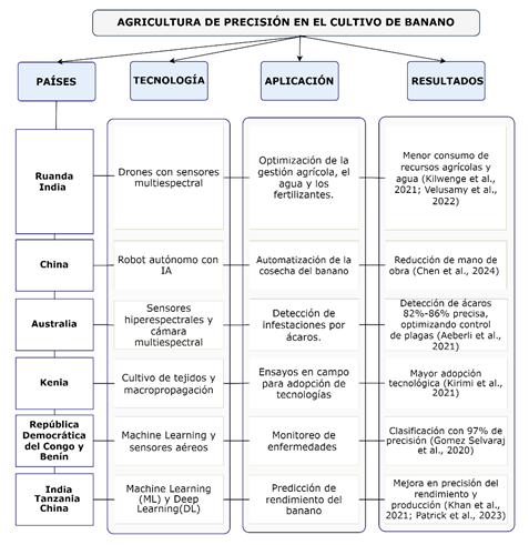 Las tecnologías de AP permiten mejorar la eficiencia en el uso de recursos, así como incrementar la productividad, la calidad, la rentabilidad y la sostenibilidad de la producción agrícola. Además, incluye la gestión específica del sitio del cultivo, la cual consiste en adaptar las prácticas agrícolas a la variabilidad espacial del suelo y a las condiciones climáticas particulares de cada parcela. En este sentido, la Figura 1 ilustra cómo las tecnologías están transformando el cultivo de banano en distintos países mediante la implementación de soluciones avanzadas.