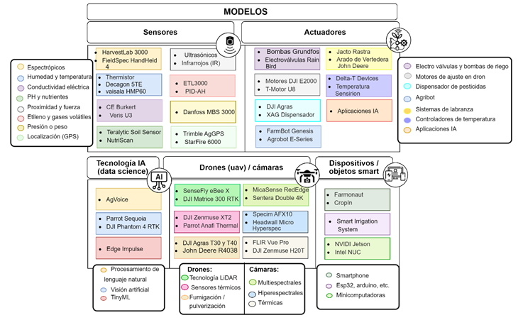 También se emplean actuadores como válvulas electrónicas, bombas de riego, motores en drones y dispensadores de pesticidas, que permiten realizar acciones automáticas según las condiciones detectadas (Ghazal et al., 2024; Talaviya et al., 2020). Además, se utilizan drones equipados con tecnología de fumigación y sensores LiDAR, cámaras térmicas y satelitales, que facilitan una observación aérea avanzada del cultivo (Bouguettaya et al., 2023). Se integran herramientas de inteligencia artificial como visión artificial, procesamiento de lenguaje natural (PLN) y TinyML, para ejecutar modelos de análisis directamente en dispositivos de bajo consumo energético (Calvo-Valverde et al., 2023; Nasim et al., 2023). Finalmente, se incluyen dispositivos inteligentes como smartphones, placas de desarrollo ESP32, Arduino, Raspberry Pi y minicomputadoras, que amplían la capacidad del sistema para monitorear, procesar y actuar en tiempo real (Mazón-Olivo, 2023; Singh et al., 2021).