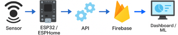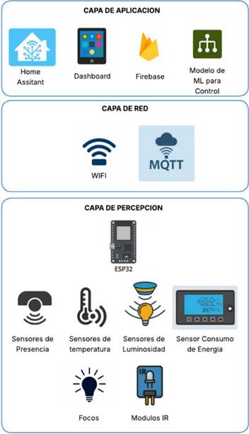 En la capa percepción se ubican los sensores encargados de registrar las variables energéticas, ambientales y de ocupación de la sala. Para el consumo eléctrico se emplearon módulos PZEM-004T conectados a ESP32, capaces de medir voltaje, corriente, potencia y energía acumulada. Además, se integraron sensores DHT11 para temperatura y humedad, junto con los módulos LD2410C basados en radar mmWave para la detección de presencia y movimiento. Todos los dispositivos se configuraron con ESPHome, lo que permitió unificar la forma en que se obtuvieron las lecturas. La Figura 2 resume esta integración en un solo esquema.
