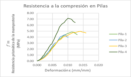 Para medir la resistencia a compresión axial de la mampostería construida con BTC se utilizaron ensayos en pilas, según la norma NEC-SE-MP, apartado 10.1. Se realizó el cálculo de la resistencia a compresión prismática según se especifica en la norma utilizada en el ensayo, y se determinó el módulo de elasticidad (E) tal como indican Turco et al. (2024). En la norma mexicana NMX-C-464 (ONNCCE, 2010), se presentan los modos de falla típicos en pilas de mampostería bajo carga axial, los cuales permiten comparar y analizar los resultados obtenidos en los ensayos.