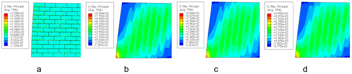 La Figura 8 muestra la distribución de los esfuerzos principales en la mampostería para las distintas configuraciones analizadas: (a) sin refuerzo, (b) con refuerzo #10, (c) con refuerzo #12 y (d) con refuerzo #14, evidenciándose que la incorporación del refuerzo vertical reduce las concentraciones de esfuerzos de tracción y compresión y favorece una distribución más uniforme a lo largo del muro, mejorando el desempeño estructural del sistema reforzado.