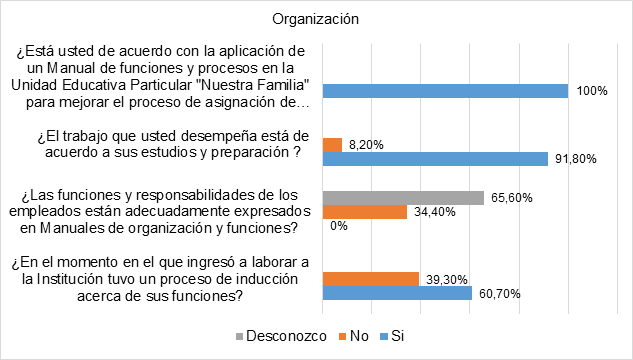 To develop an administrative structure, it is necessary to establish an orderly process for the functions carried out by the educational units, so that it allows them to designate decentralized responsibilities and specify their work areas through planning, organization, direction, coordination and control, the objective of This research is to propose a new administrative structural implementation that improves the functions of the Nuestra Familia Private Educational Unit, which allows to know the members of the educational entity, their functions and responsibilities at the level of the different positions. The field study is non-experimental, descriptive. The results were obtained through surveys applied to all personnel, therefore, it was possible to analyze that the institution does not carry out an adequate management of human resources and needs to implement a human talent department that facilitates the management and control of all functions and personnel processes.