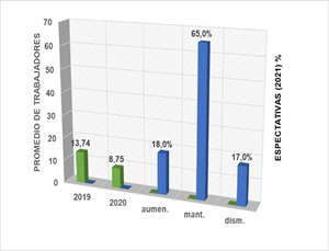 De acuerdo con los datos de la encuesta en lo referente al promedio de empleados de las MYPYMES se establece que el año 2020 existió una disminución de 4,99 puntos respecto al año 2019. Para el 2021 el 65% de las empresas presentan una tendencia favorable para mantener el número de empleados, un 18% de las empresas aumentarán sus empleados y un el 17% disminuirán sus empleados (Figura 6).