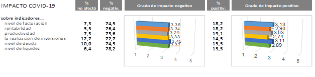 La crisis generada por el COVID-19, afectado significativamente a diversos indicadores económicos y financieros de las PYPIMES. El 76,5% de las empresas vieron afectado su rentabilidad, otro indicador que disminuyo fuel el nivel de Facturación del 74,5% de empresas, La implementación de medidas de contención para el COVID-19, causo que el 73,6% de empresas disminuyeran sus niveles de productividad, el 72,7% presentaron disminuciones en sus inversiones, así mismo el nivel de deuda aumento en muchas empresas, un porcentaje mínimo de empresas no presentaron problemas en su liquidez (Figura 9)