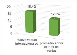Figura 10. Porcentaje de empresas que realizan ventas internacionales y promedio que suponen en el total de ventas para 2020.