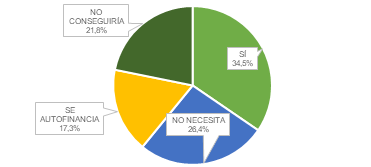 Toda crisis genera problemas económicos más cuando no están previstas por las empresas, pues entonces hay que recurrir a medios de auxilio para poder afrontar los gastos, esto se refleja en los datos obtenidos por el estudio que nos arroja porcentajes que merecen preocupación ya que el 34,5% de las MIPYMES se han visto obligados a recurrir al financiamiento con entidades de crédito, mientras que el 26,4% de MIPYMES no han necesitado dicho financiamiento y solo el 17,3% se autofinanciaron. Así mismo se establece del estudio que un 21,8% de empresas no han solicitado financiamiento aun necesitándolo porque no tienen la certeza que se les pueda otorgar (Figura 16)