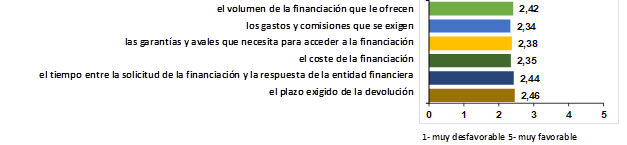 Las variables con mayor desarrollo son: plazo exigido para la devolución del financiamiento con 2,46 puntos, seguido del periodo entre la solicitud y respuesta de financiamiento con 2,44 puntos, el monto de financiamiento que oferta las entidades con una puntuación de 2,42 puntos, las garantías exigidas con 2,38 puntos negociación del financiamiento, el costo de la financiación con 2,35 puntos y finalmente con una evolución menos favorable los gastos de comisión con 2,34 puntos. (Figura 18)