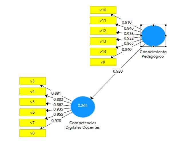Adicionalmente, para lograr el objetivo propuesto en la presente investigación fue necesario efectuar una asociación entre las variables planteadas en el instrumento de medición: las competencias digitales y conocimiento pedagógico. Esto se logró mediante la aplicación del método de ecuaciones estructurales a través del programa SmartPLS, que posibilita estimar relaciones causales en donde se utilizan datos estadísticos y suposiciones causales (Alvarado et al., 2016).