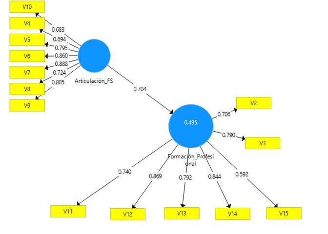 La relación establecida en el modelo de las variables propuestas, cuyo peso específico es de 0.704 se ajusta perfectamente con lo encontrado en la revisión bibliográfica en donde se evidencia un consenso sobre la influencia positiva que tiene la articulación de las funciones sustantivas con la formación profesional (Pabón-Serrano, et al. 2020), (Cordón & Cordón, 2019), (Franco-Pombo, 2017). Además, el resultado obtenido puede ser considerado de mucha importancia, dado que, en el Ecuador el proceso de articulación de las funciones sustantivas es uno de los aspectos que viene establecido en el modelo de evaluación del CACES como escenario al que debería propender toda institución de educación superior.