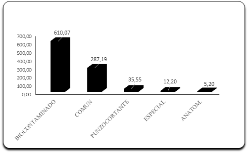 En la Figura 2 se observa que la mayor producción diaria de residuos generados por peso corresponde a los residuos biocontaminados con 610.07 kg., seguido por los residuos Comunes con una producción de 287.19 kg., luego están los residuos punzocortantes con 35.55 kg., los Residuos Especiales con 12.20 y, en menor cantidad de producción, se encuentran los residuos Anatomopatológico con 5.20 kg.