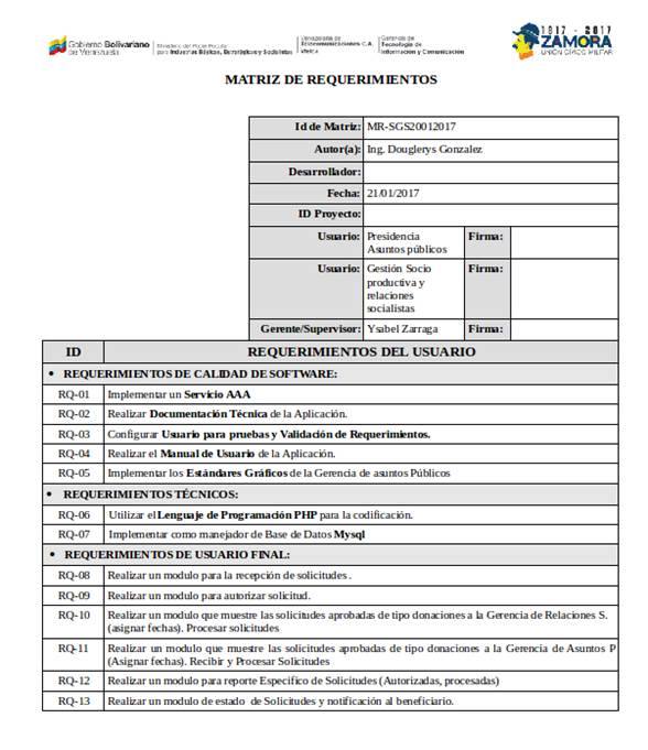 De acuerdo al cuestionario se permitió recabar y analizar todos los datos necesarios para lograr determinar con exactitud qué tipo de información requería el sistema propuesto. Luego de ello se llenaron dos matrices de requerimientos para el sistema de información propuesto, una donde se especifica los módulos donde trabajaran los usuarios externos, y otra para los módulos de personal administrativo de fábrica VTELCA, como se observa a continuación: