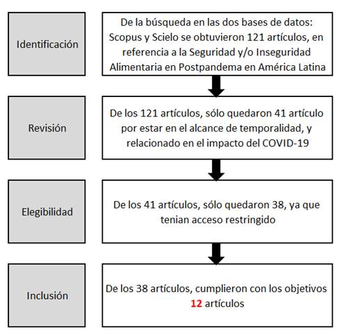The COVID-19 pandemic continues to be a threat that directly affects the health and economy of the person, country, continent, hitting one more than others; Asia being the continent that spread the virus, however Latin America is considered as its epicenter, due to the greater number of registered cases; affecting to a greater extent Brazil, Argentina and Mexico. The objective of the review is to analyze the impact generated by the COVID-19 pandemic in terms of food security in Latin America. Twelve (12) scientific articles in Spanish, English and Portuguese from Scopus and Scielo were analyzed, using the Prisma method, with inclusion and exclusion criteria, with articles published between 2021 and 2023. Among the results obtained, it is concluded that the confinement produced by COVID-19 originated and triggered Food Insecurity (FI). Comprehensive and articulated public policies are recommended to address food insecurity (FS).