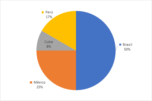 Conforme a los objetivos establecidos, se presentan los resultados obtenidos tras el análisis de los 12 artículos seleccionados para la sección analítica de la investigación. De acuerdo con los resultados obtenidos mediante el método Prisma, se ha limitado la selección a doce (12) investigaciones según la base de datos, como se muestra en la Figura 1. Se destaca que Brasil representa el 50% de las publicaciones, con un total de seis (6) artículos. A continuación, México ocupa el 25% de las publicaciones, con tres (3) artículos. En orden de representación, le siguen Perú, contribuyendo con un 17% de las publicaciones, totalizando dos (2) artículos, y Cuba, con una representación del 8%, contribuyendo con un (1) artículo.