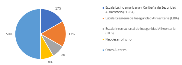 Uno de los primeros objetivos de la investigación consiste en exponer las bases teóricas y premisas conceptuales. Según se observa en la Figura 3, el 17% de las investigaciones, equivalente a dos (2) artículos de autores mexicanos, se centraron en analizar la Inseguridad Alimentaria utilizando la Escala Latinoamericana y Caribeña de Seguridad Alimentaria (ELCSA). Otro 17%, correspondiente a dos (2) artículos de autores brasileños, abordaron la Inseguridad Alimentaria en función de la Escala Brasileña de Inseguridad Alimentaria (EBIA). Por otro lado, el 8%, representado por un (1) artículo de un autor brasileño, analizó la Inseguridad Alimentaria según la Escala Internacional de Inseguridad Alimentaria (FIES), mientras que otro 8%, también de un (1) artículo de autor brasileño, desarrolló la teoría del neodesarrollismo. El restante 50% de las investigaciones se dedicó a explorar premisas conceptuales propuestas por diversos autores.
