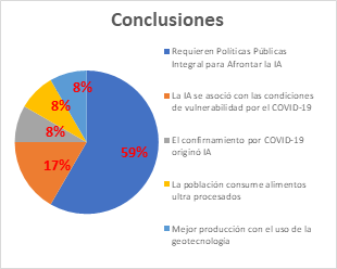 En México, los autores Ávila Arcos et al. (2021) y Rodríguez Ramírez et al. (2021) utilizaron como base de estudios la Encuesta Nacional de Salud y Nutrición COVID-19, desarrollando investigaciones variadas, correlacionales y descriptivas de tipo cuantitativo. En cambio, el autor Martínez-Valdés (2021) optó por un enfoque cualitativo y de nivel exploratorio. Llegaron a las siguientes conclusiones: se requieren políticas públicas integrales para afrontar la inseguridad alimentaria y el confinamiento por COVID-19 originó la inseguridad alimentaria.