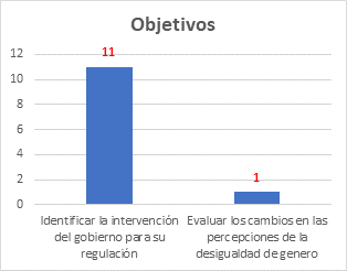 De acuerdo con lo establecido en la Tabla 4, se observa que los objetivos revisados en cada una de las investigaciones, podemos evidenciar que once (11) de ellas muestran en gran medida la preocupación e interés respecto a “Identificar la intervención del gobierno para su regulación” como se puede observar en la Figura 5, y una (1) de ellas en “Evaluar los cambios en las percepciones de la desigualdad de género”