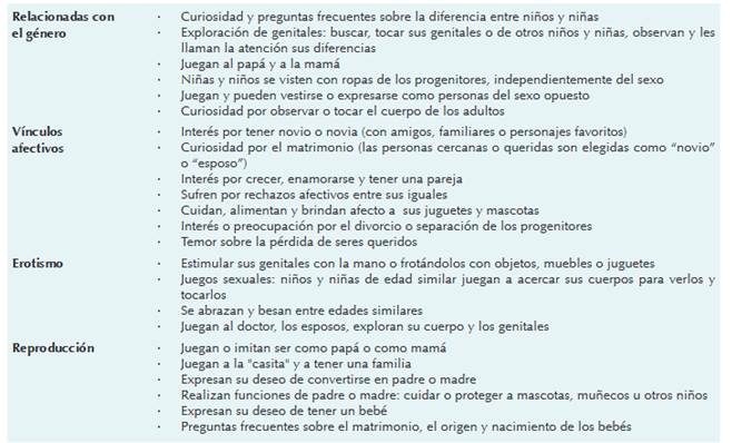 En torno a los 3 ó 4 años puede mostrar interés por los genitales de otros niños o de sus padres. Pueden tocar los pechos de mujeres o mirar a adultos desnudos. Empiezan a hacer preguntas sobre el porqué de las diferencias entre sexos y sobre la reproducción y el origen de los bebés. Observan con atención lo que sucede entre los adultos que los rodean. Es normal que imiten comportamientos y que inicien los juegos sexuales infantiles como besarse o cogerse de las manos, jugar "a médicos" o "a papás y mamás".