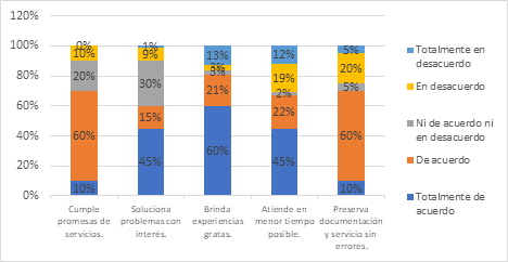 Con base en los resultados de la encuesta, se evidencia que el hotel tiene fortalezas significativas en el cumplimiento de sus promesas de servicio (70% entre "totalmente de acuerdo" y "de acuerdo") y en la preservación de documentación y registros (70% de respuestas positivas). Sin embargo, existen áreas críticas que necesitan atención, como la atención en el menor tiempo posible, donde más del 30% de los usuarios están en desacuerdo, y el manejo de problemas, con un 30% en posición neutral, lo que sugiere que hay margen para mejorar la percepción de interés y resolución (Figura 1).