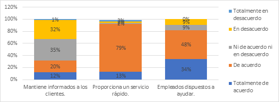 Los resultados de la dimensión de sensibilidad (Figura 2) destacan dos puntos clave. Los empleados reciben una alta valoración en su disposición a ayudar (82% entre "totalmente de acuerdo" y "de acuerdo") y en la rapidez del servicio (92% positivas), lo que refleja fortalezas significativas en la atención al cliente. Por otro lado, la comunicación sobre la ejecución de servicios es una debilidad evidente, con un 67% entre neutrales y negativas, indicando que los clientes perciben falta de información o claridad en este aspecto, lo cual requiere atención prioritaria para mejorar la percepción global de sensibilidad.