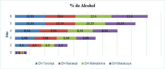 Las muestras evaluadas mostraron una variación en la evolución del grado alcohólico, específicamente en el tercer y cuarto día en los casos del vino de Toronja y Naranja y mantuvieron su balance en los casos de Mandarina y Maracuyá. Sin embargo, el grado alcohólico al final es menor en los dos primeros casos (Vino de Toronja y Naranja).
