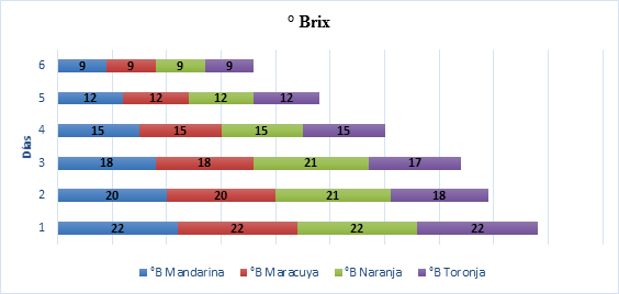 El método regular para la evaluación de azucares en industria es °B, durante lo cual solo presento una pequeña variación en la Naranja y Toronja en el segundo y tercer día.